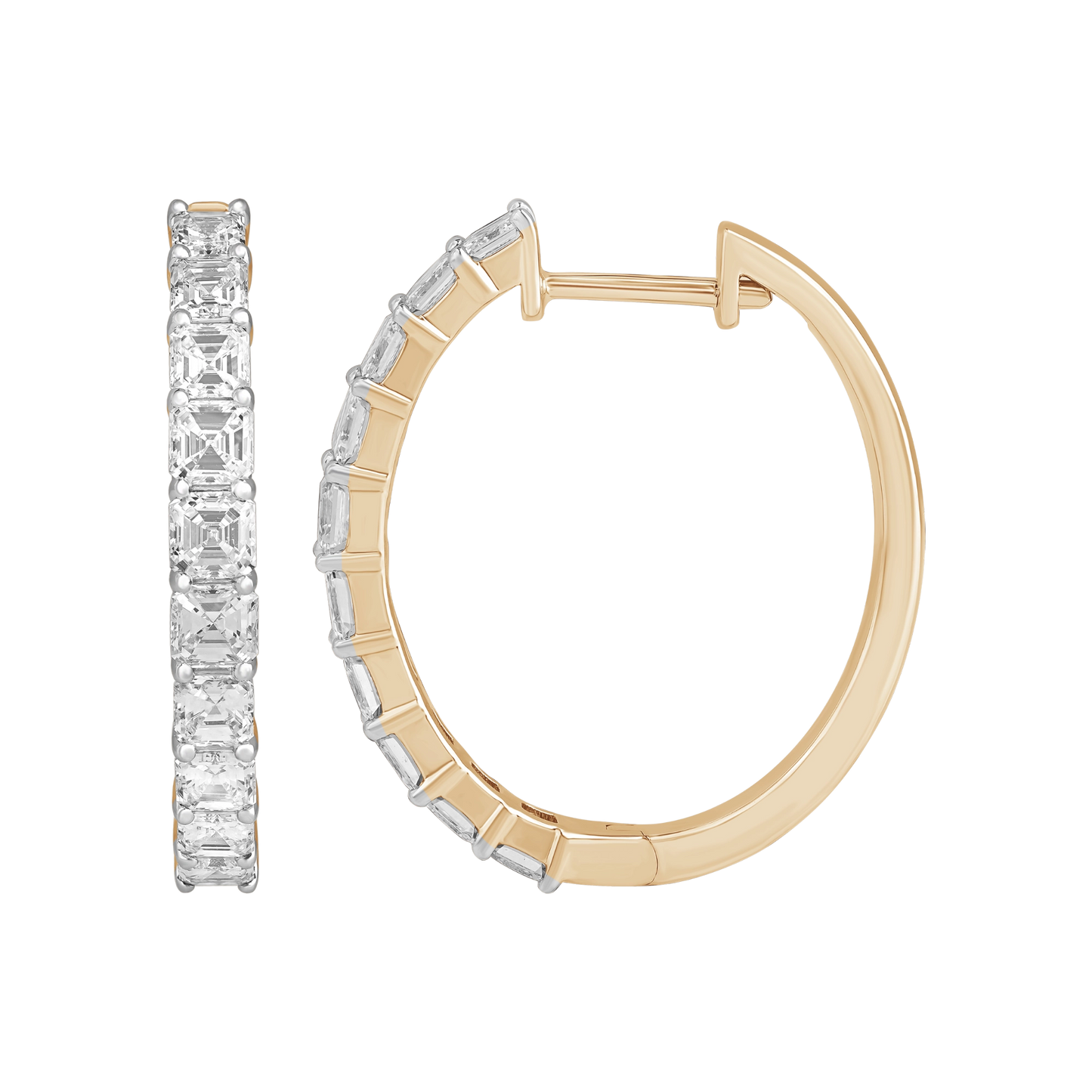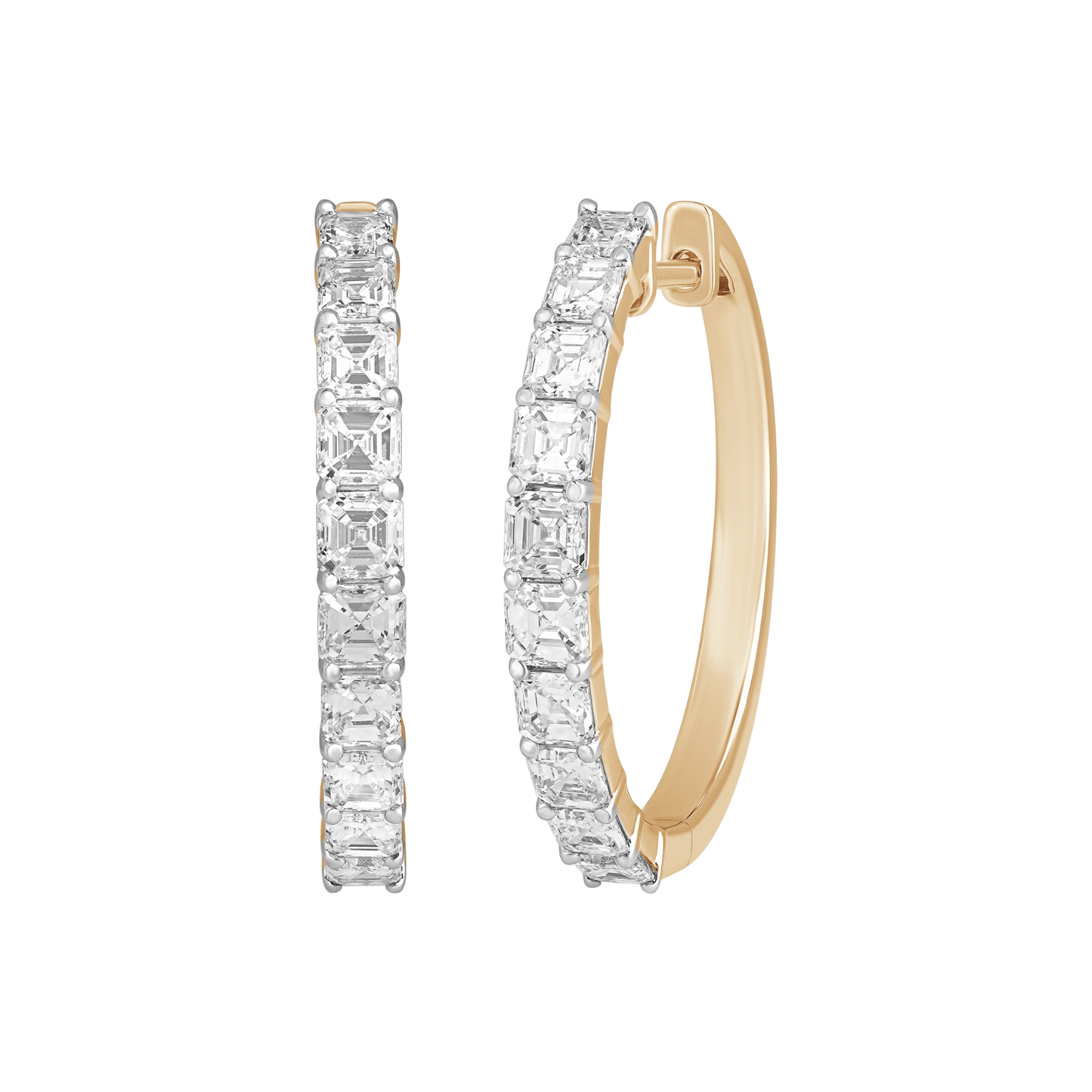 Set with natural asscher cut diamonds totaling 2 carats, selected in VS clarity and FG color. Asscher cuts are valued for their step facets and depth, creating a hall of mirrors effect. Crafted in 14k gold by RJC-certified partners, the arc setting maintains alignment while allowing the hoop to sit comfortably on the ear.